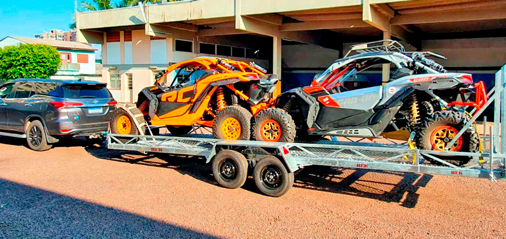 Reboque para UTV Duplo com estrutura de aço, produto com fabricação própria, produzimos conforme sua necessidade. Reboque dentro de todas as normativas para sua segurança e tranquilidade para seu lazer. Por ser um produto homologado, pode ser emplacado e trafegar em rodovias e demais meios de acesso a praias, represas e outros locais de lazer. Você que gosta de aventura encomende já o seu.